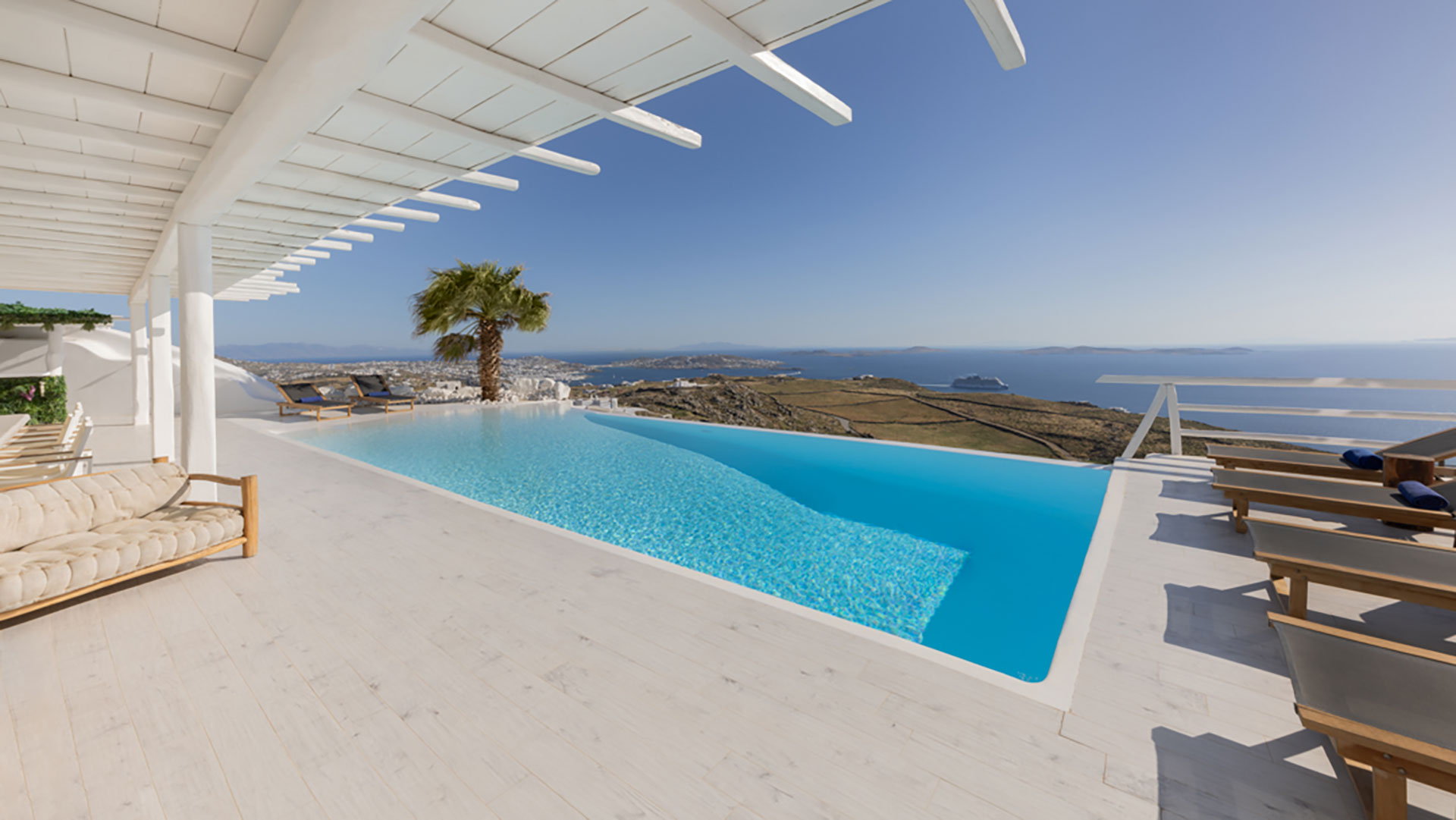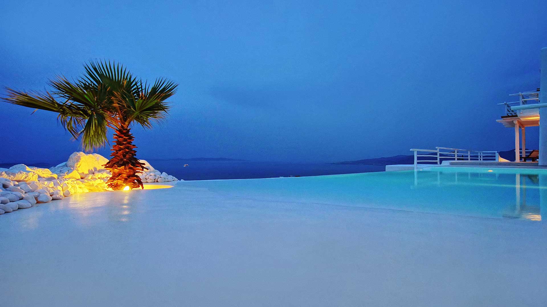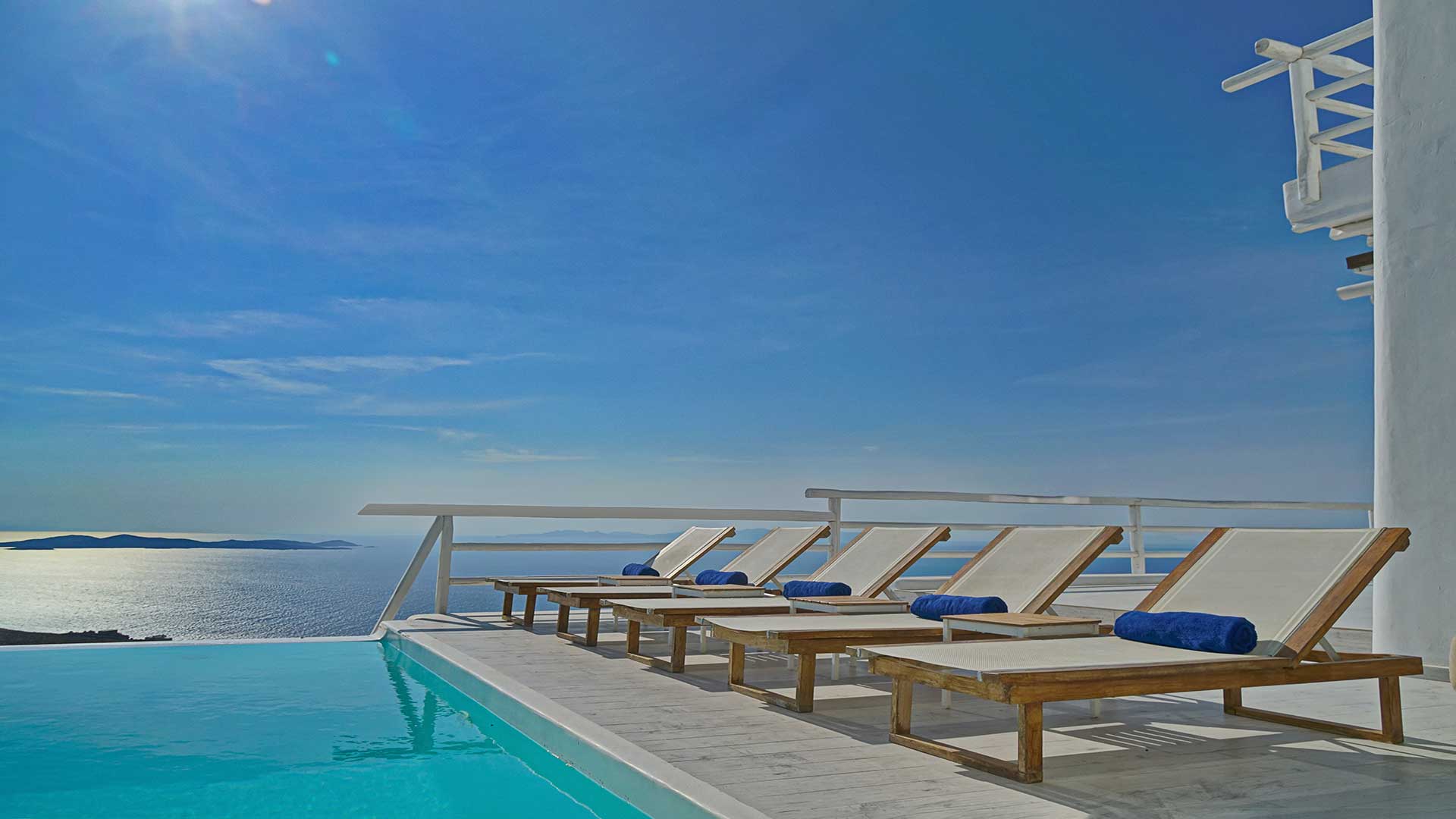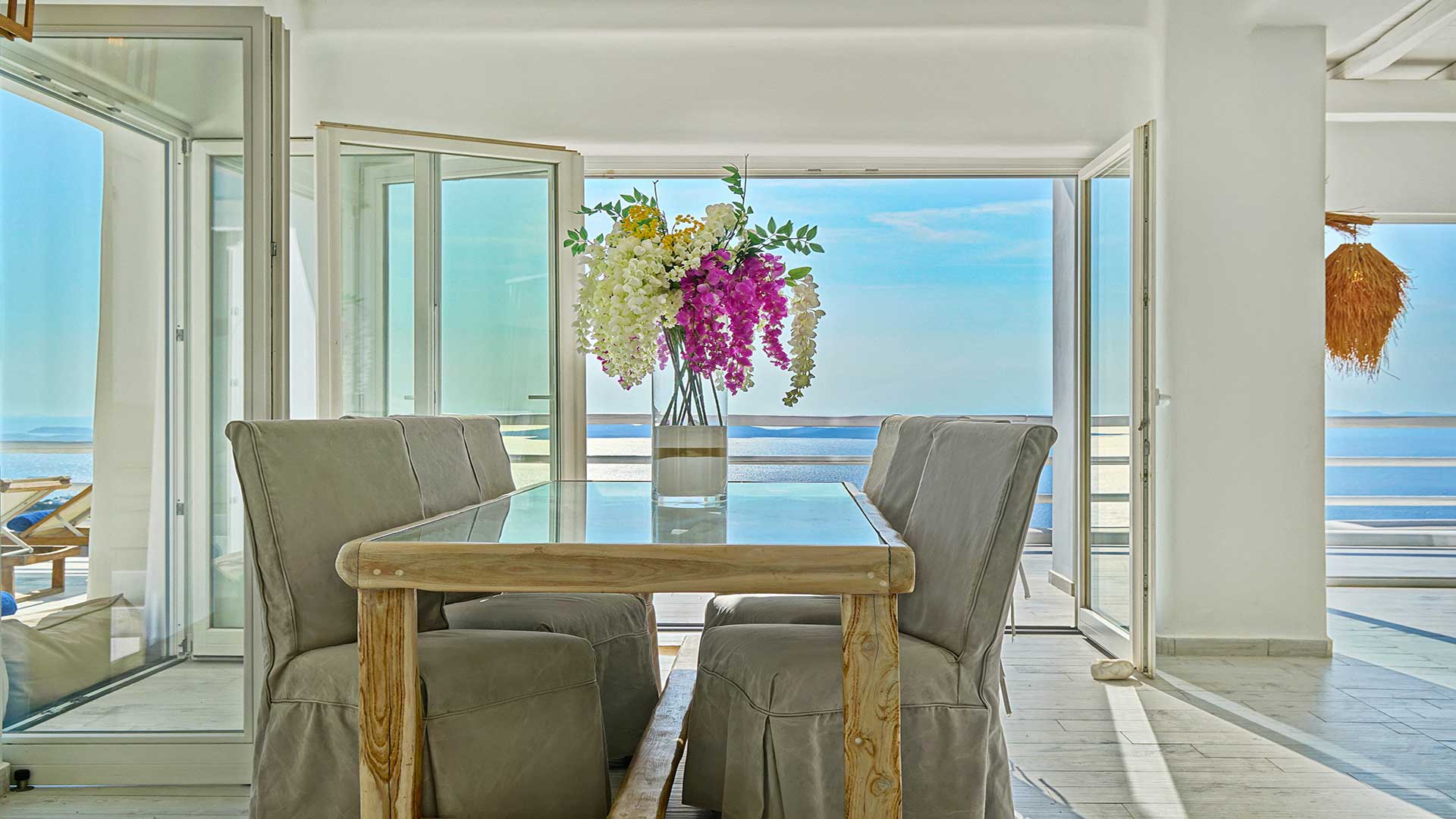 The infinity pool is located on the main level, offering a beach – like shape giving the extraordinary feelling of a tropical retreat in the most cosmopolitan island of Greece, just infrond of the holy spiritual island of Delos.