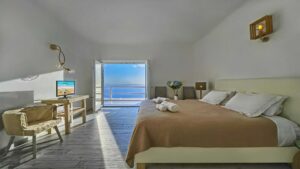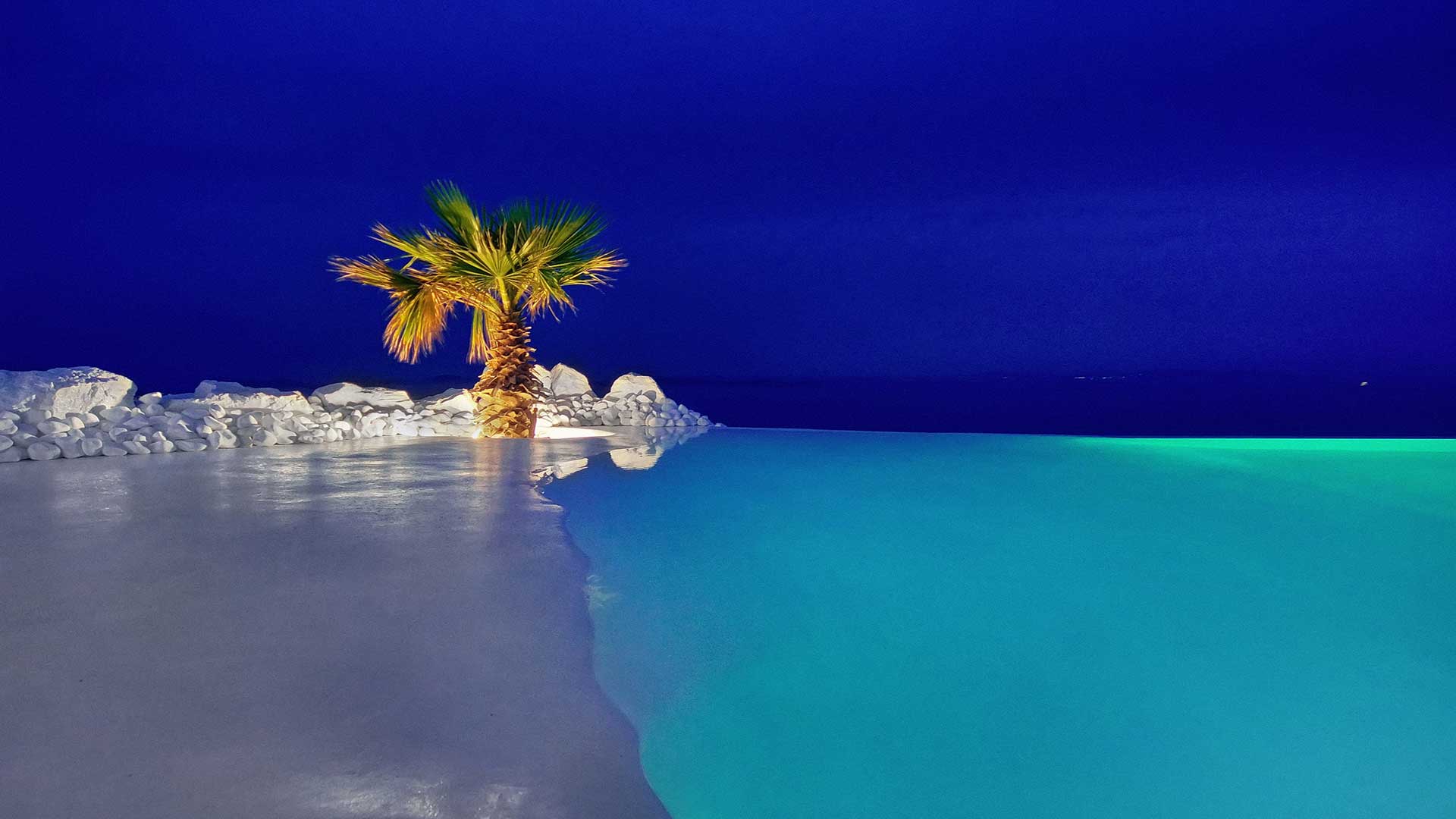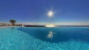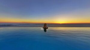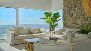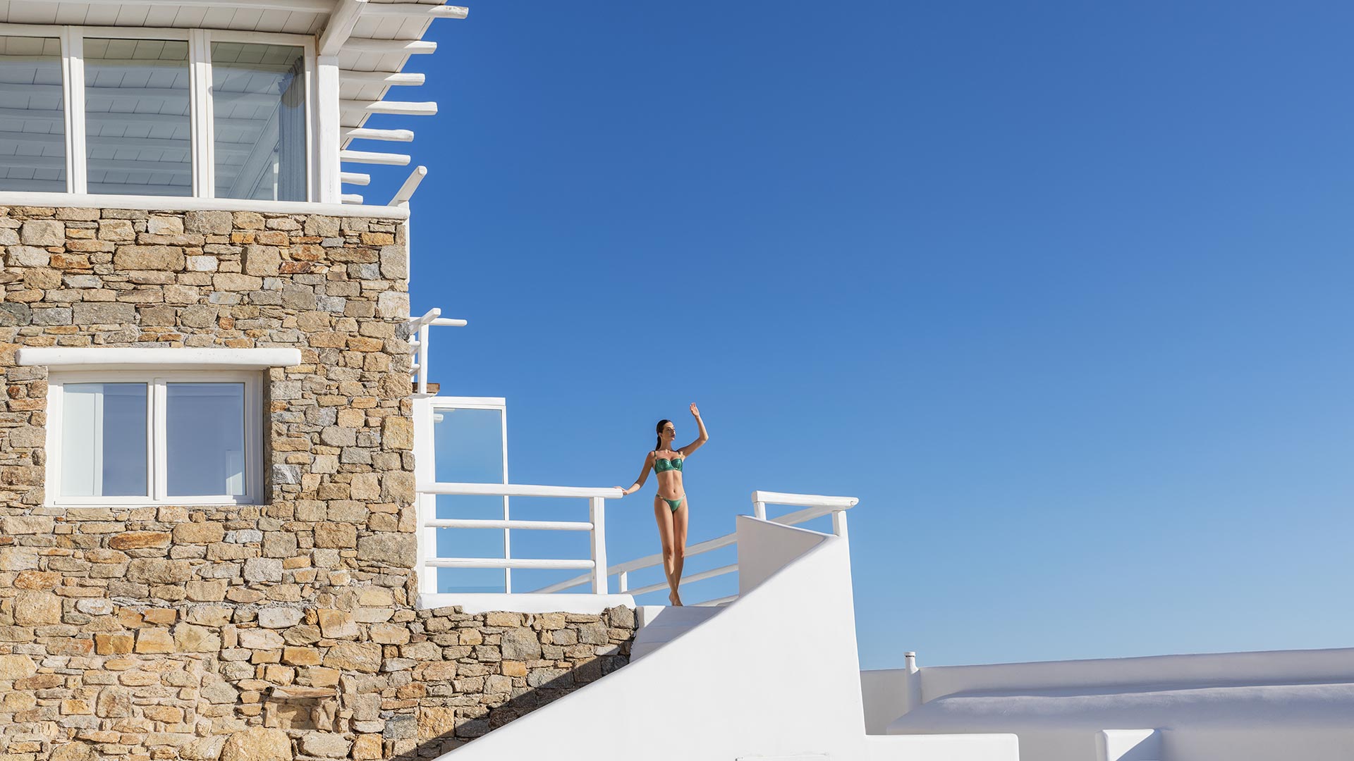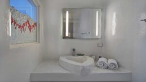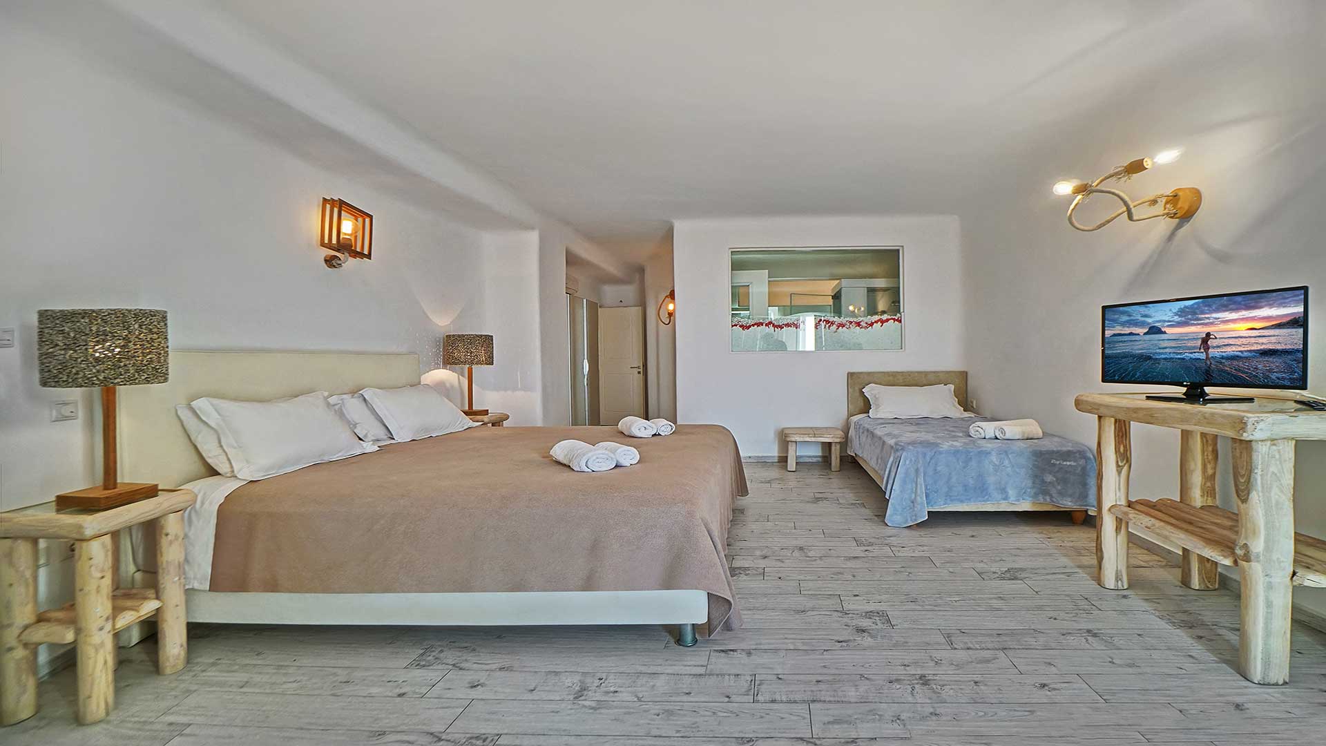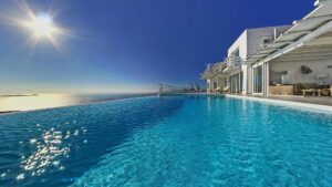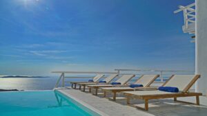 The infinity pool is located on the main level, offering a beach – like shape giving the extraordinary feelling of a tropical retreat in the most cosmopolitan island of Greece, just infrond of the holy spiritual island of Delos.